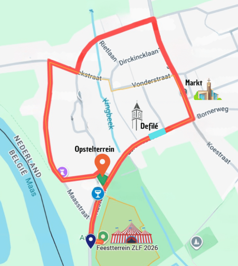 De eerste schutterij vertrekt om 13.30u vanaf het opstelterrein aan het Ecrevisseplantsoen, de Emmastraat in en dan rechtsaf naar de Maasstraat. Hierna weer rechtsaf de Broekstraat in om dan weer linksaf de Europalaan in te gaan. Aangekomen op de Kempenweg slaat de optocht af naar rechts en loopt terug naar de dorpskern langs de markt en slaat op het kruispunt rechtsaf de Ecrevissestraat in waar bij de oude kerktoren het defilé zal plaatsvinden, waarna de schutterijen terug over de Kasteelweg het feestterrein op zullen marcheren.